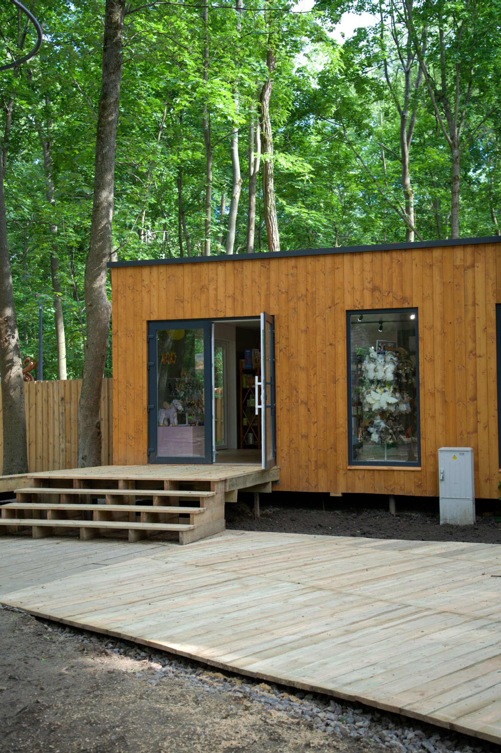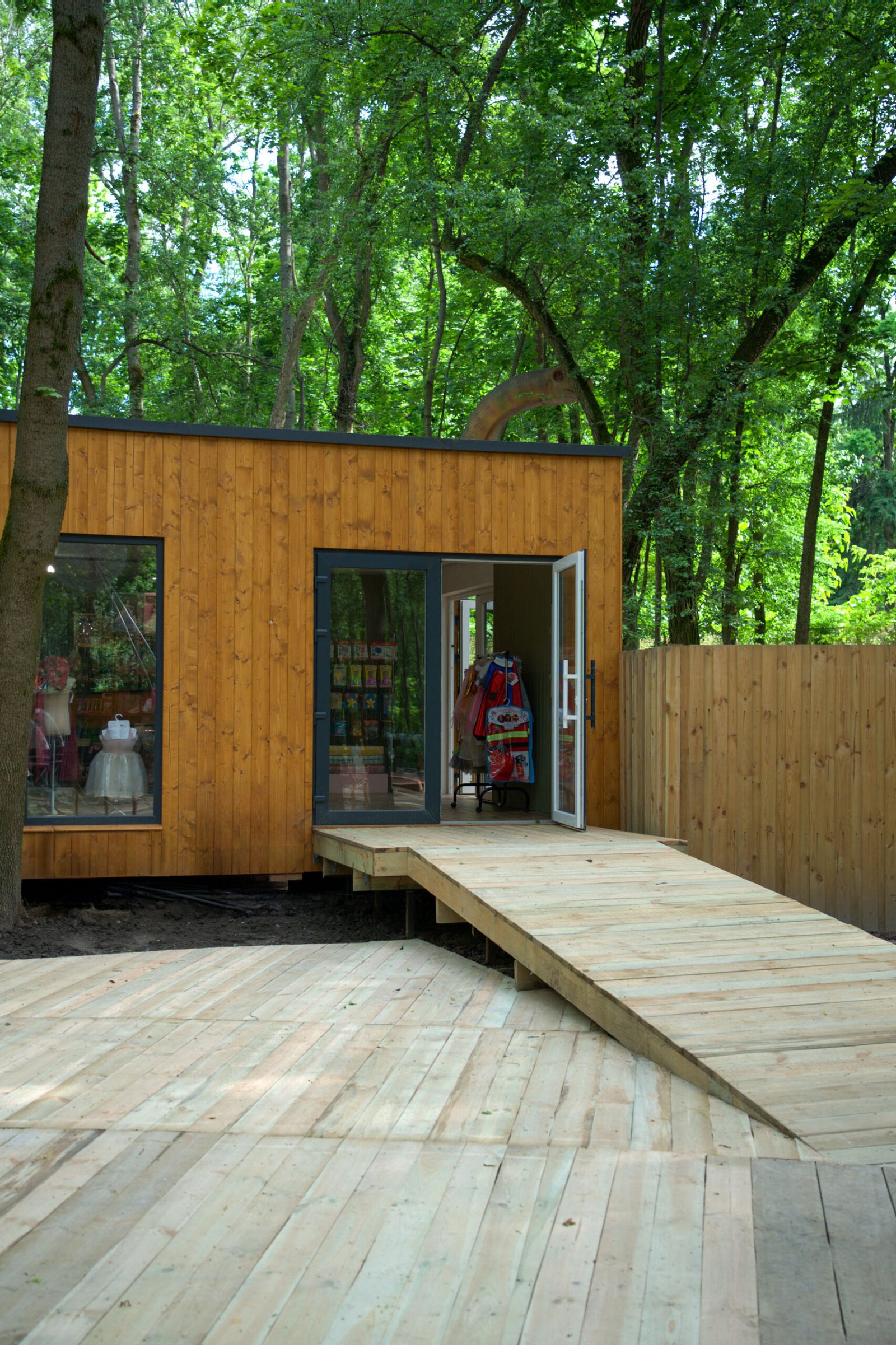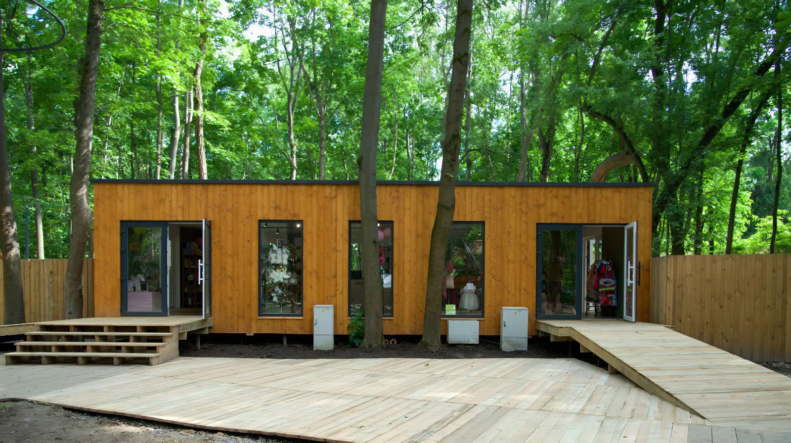 • Функціонал: Енергоефективна будівля для рітейлу, яка захищає товар і персонал від погодних умов. Лаконічний екстер’єр не відволікає увагу від загальної атмосфери парку, але чітко маркує зону покупок.