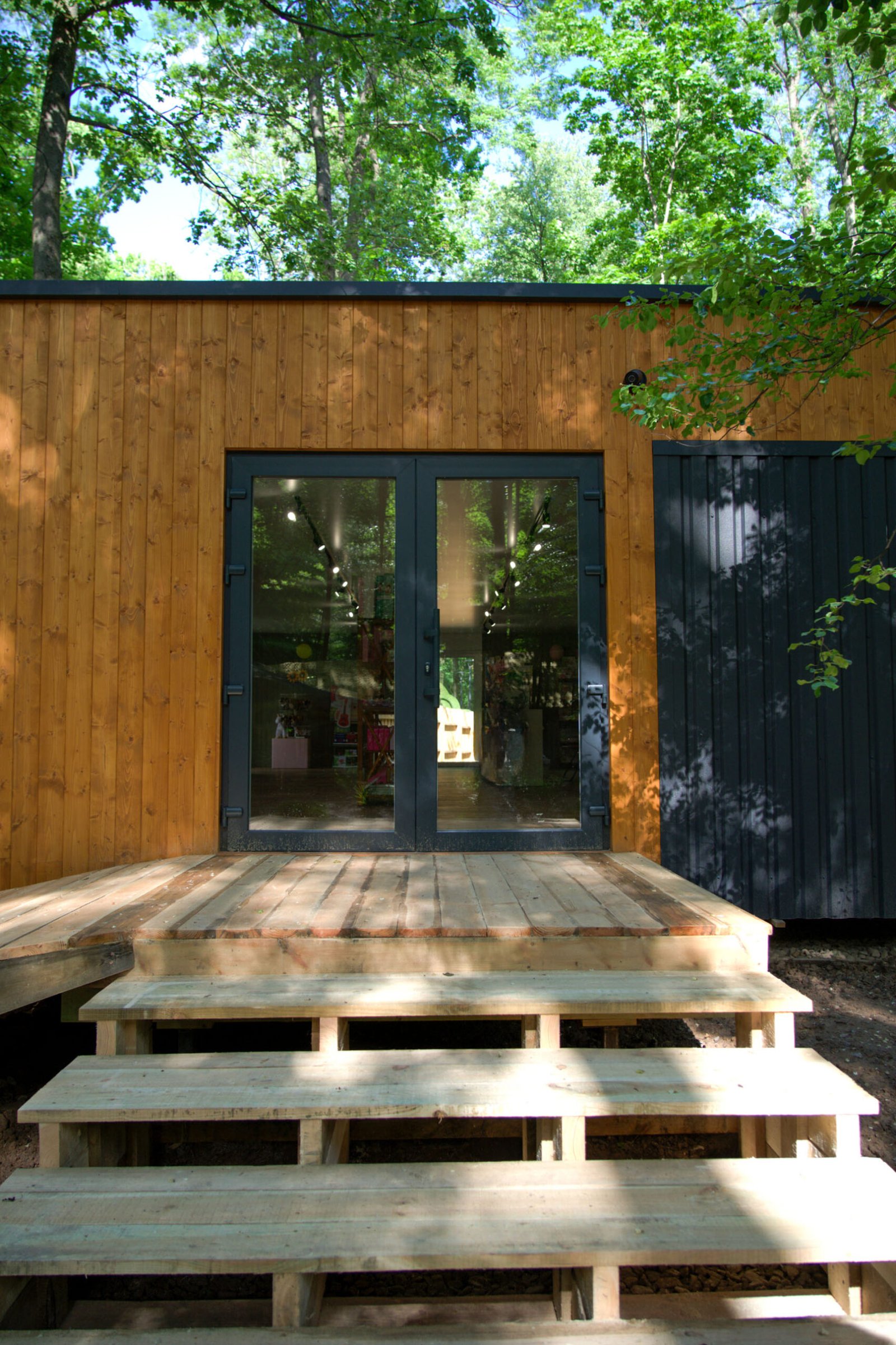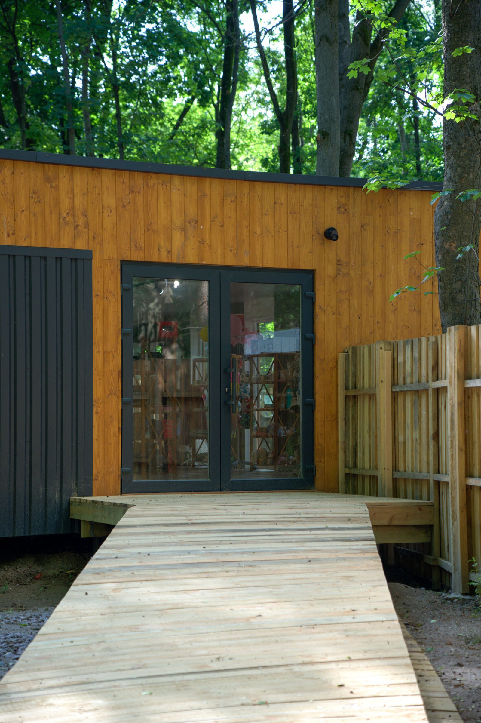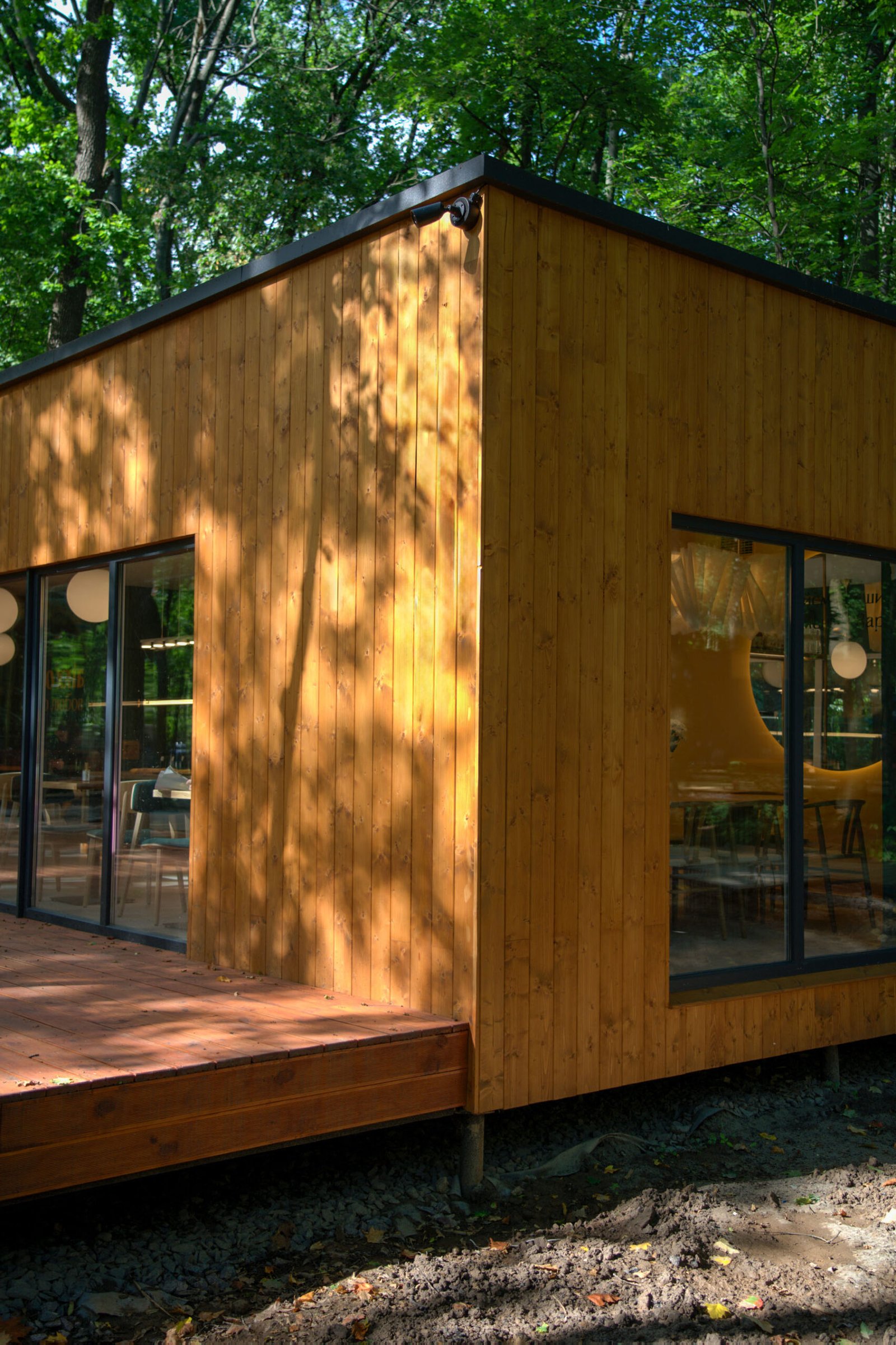 • Функціонал: Енергоефективна будівля для рітейлу, яка захищає товар і персонал від погодних умов. Лаконічний екстер’єр не відволікає увагу від загальної атмосфери парку, але чітко маркує зону покупок.