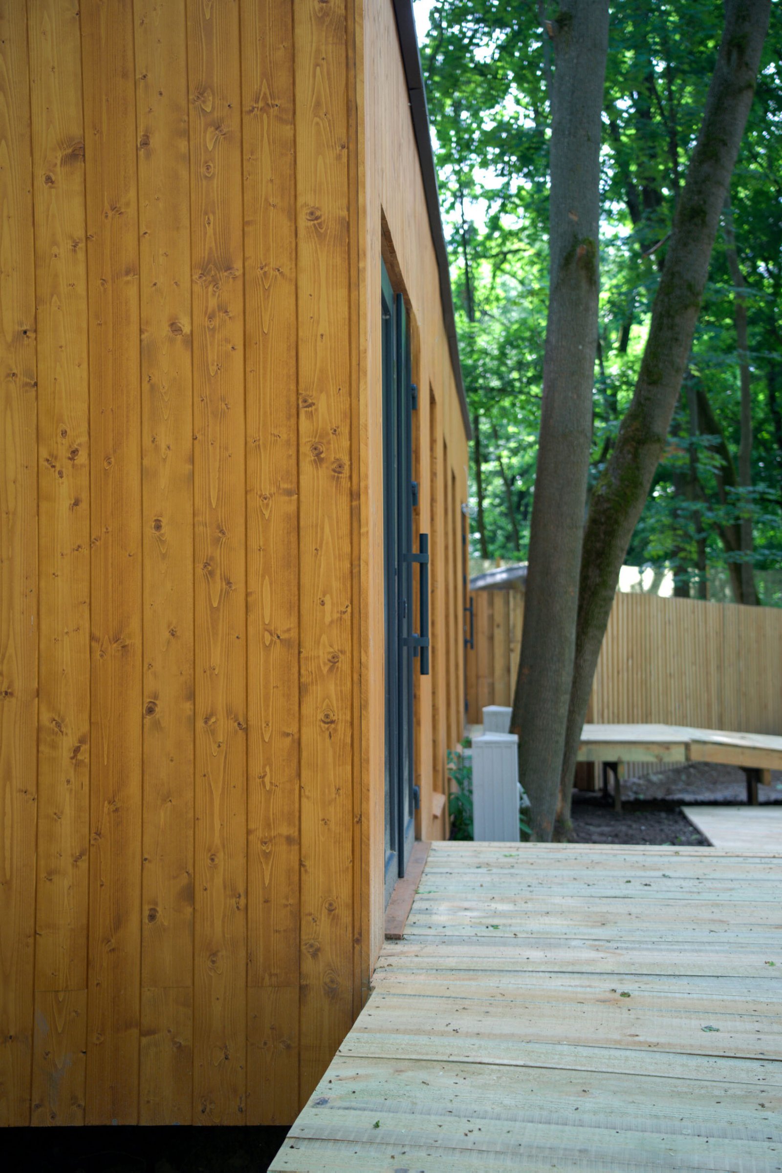 Ми застосували технологію заводського виробництва (pre-fab). Це дозволило перенести 90% брудних та гучних робіт у цех, гарантувати високу точність складання конструкцій і зберегти ліс недоторканим.