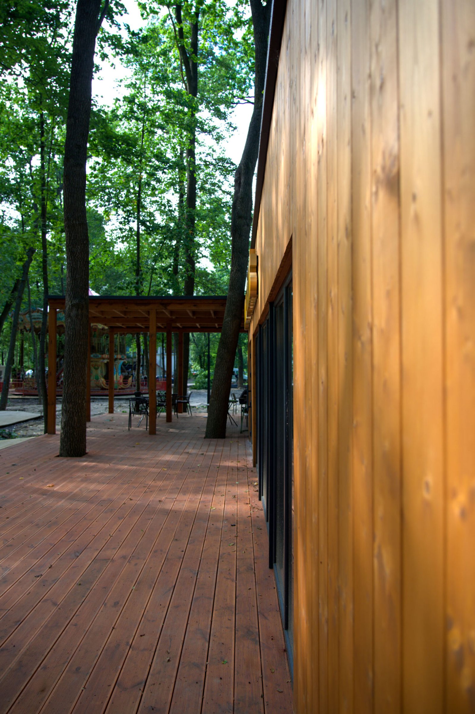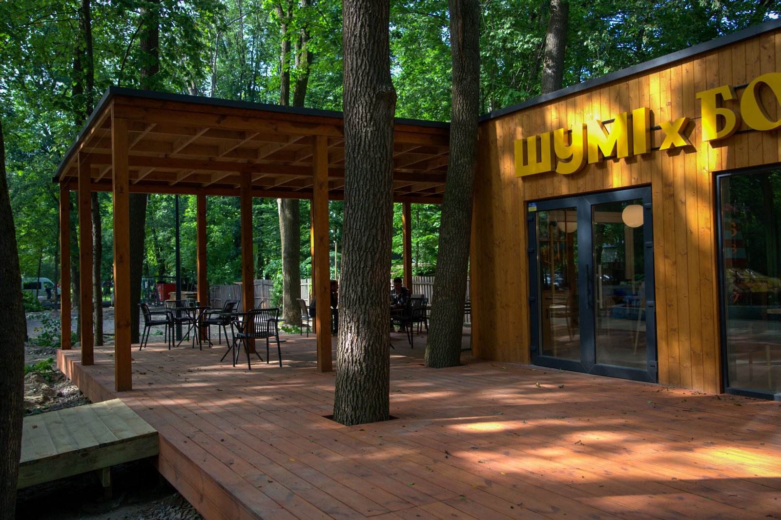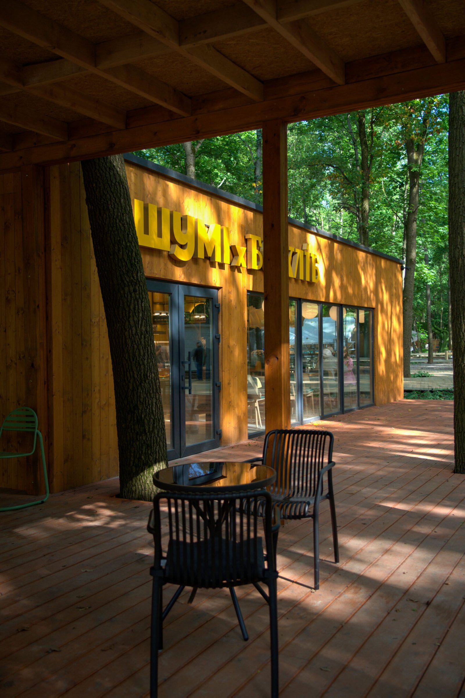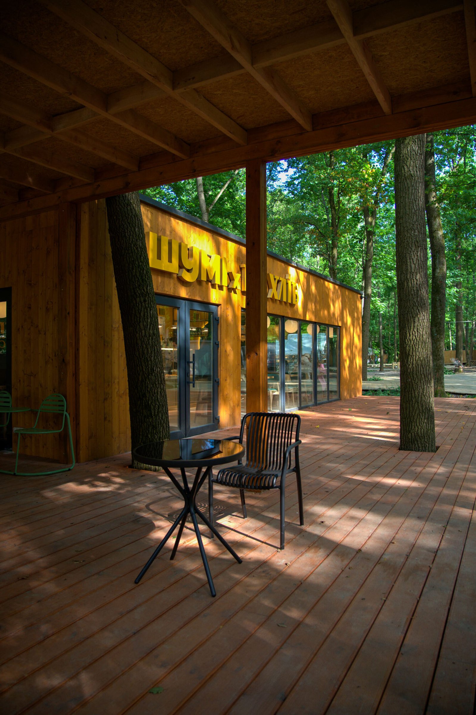 • Інженерне рішення: Ми «обійшли» природу — живі стовбури дерев проходять крізь підлогу та дах тераси. Це створило унікальний ефект присутності: гості обідають буквально під кронами дерев.