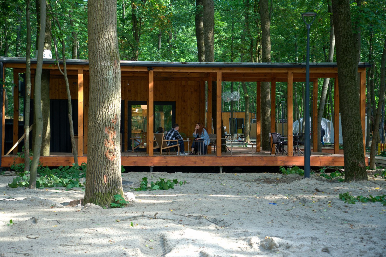 1. Панорамний ресторан (90 м² приміщення + 150 м² тераси) Це головний об’єкт гостинності в парку. Щоб вписати його в щільну посадку лісу, ми адаптували проєкт під існуючі дерева.