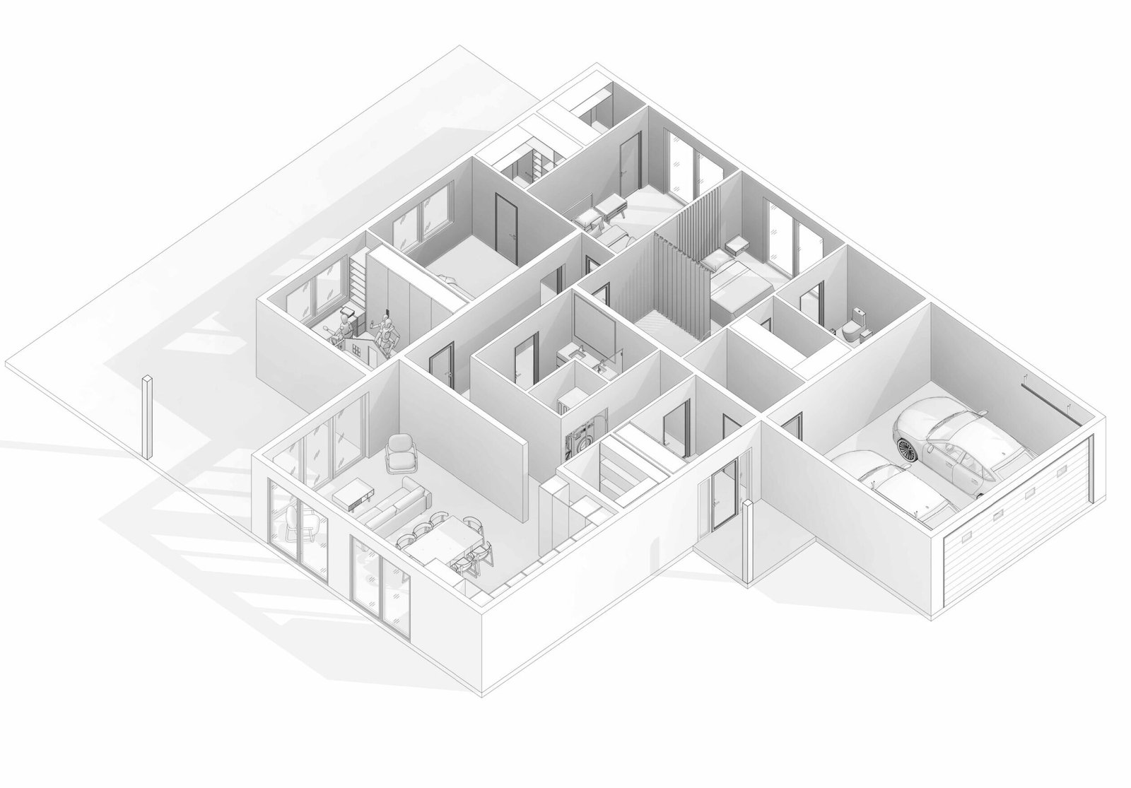 Функціональний одноповерховий будинок з гаражем та чотирма окремими кімнатами, створений для комфортного життя великої родини.