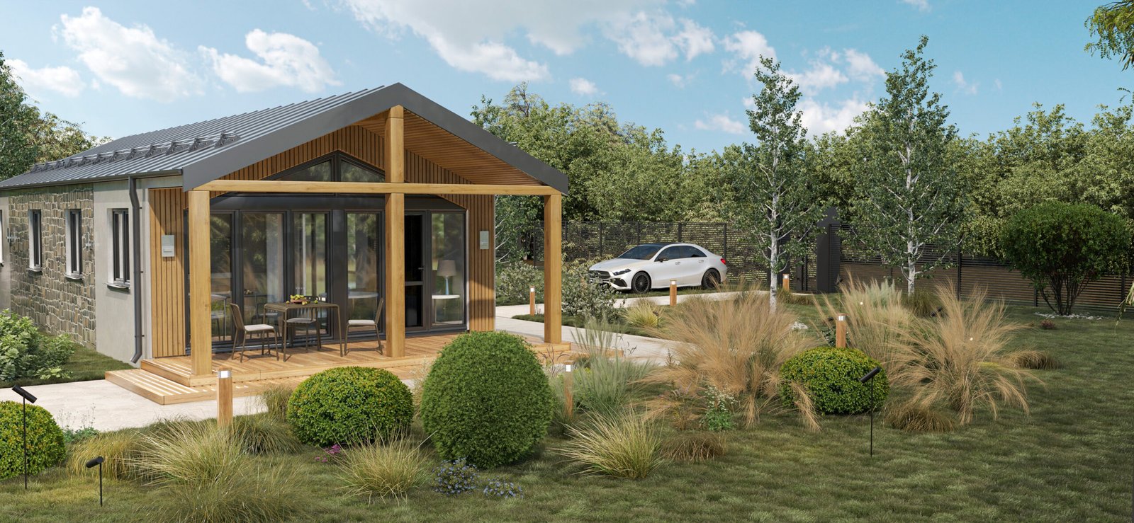 Це сучасний будинок, який поєднує панорамну архітектуру, комфортне планування та енергоефективну технологію будівництва, створюючи ідеальний простір для життя біля природи.