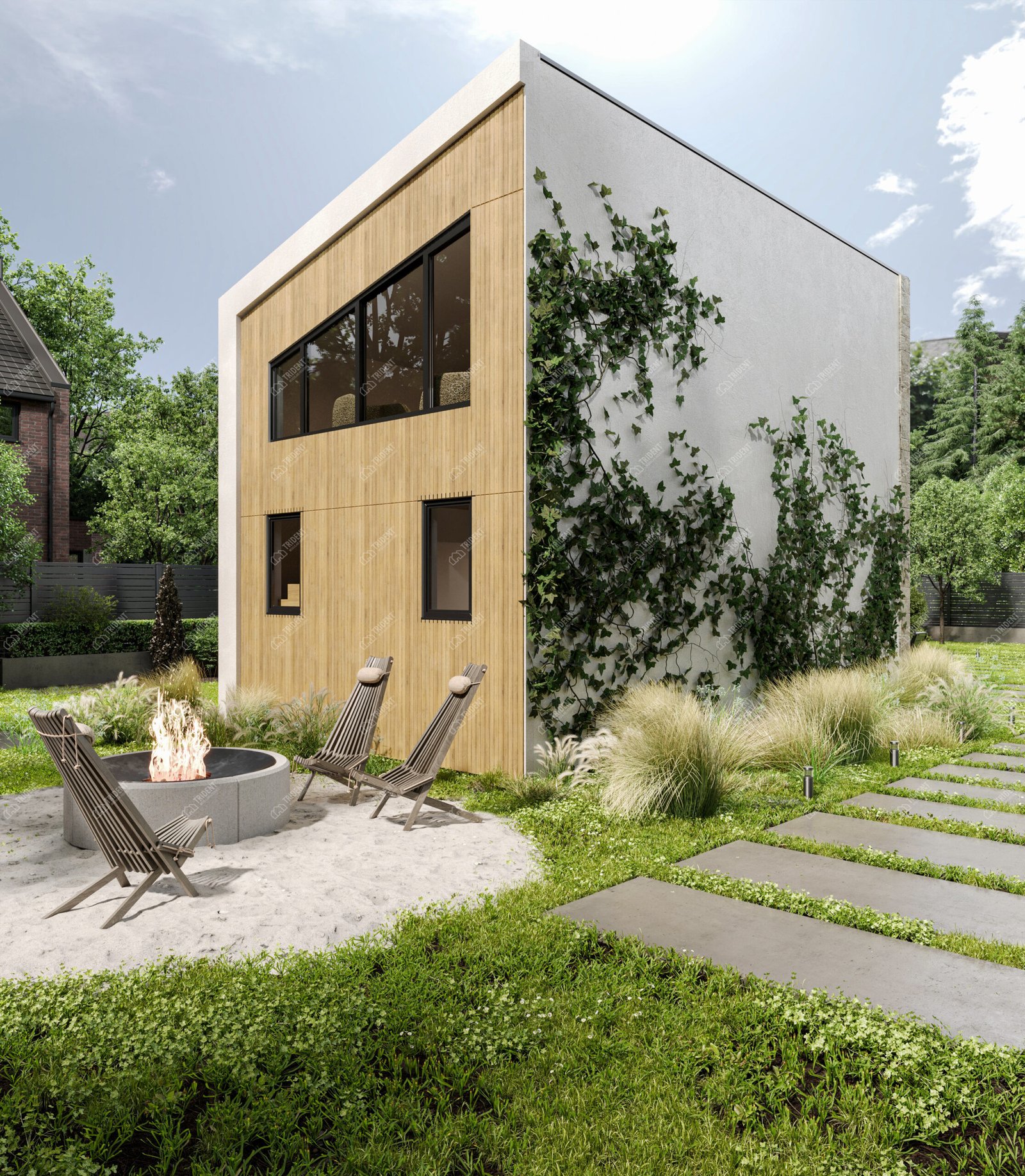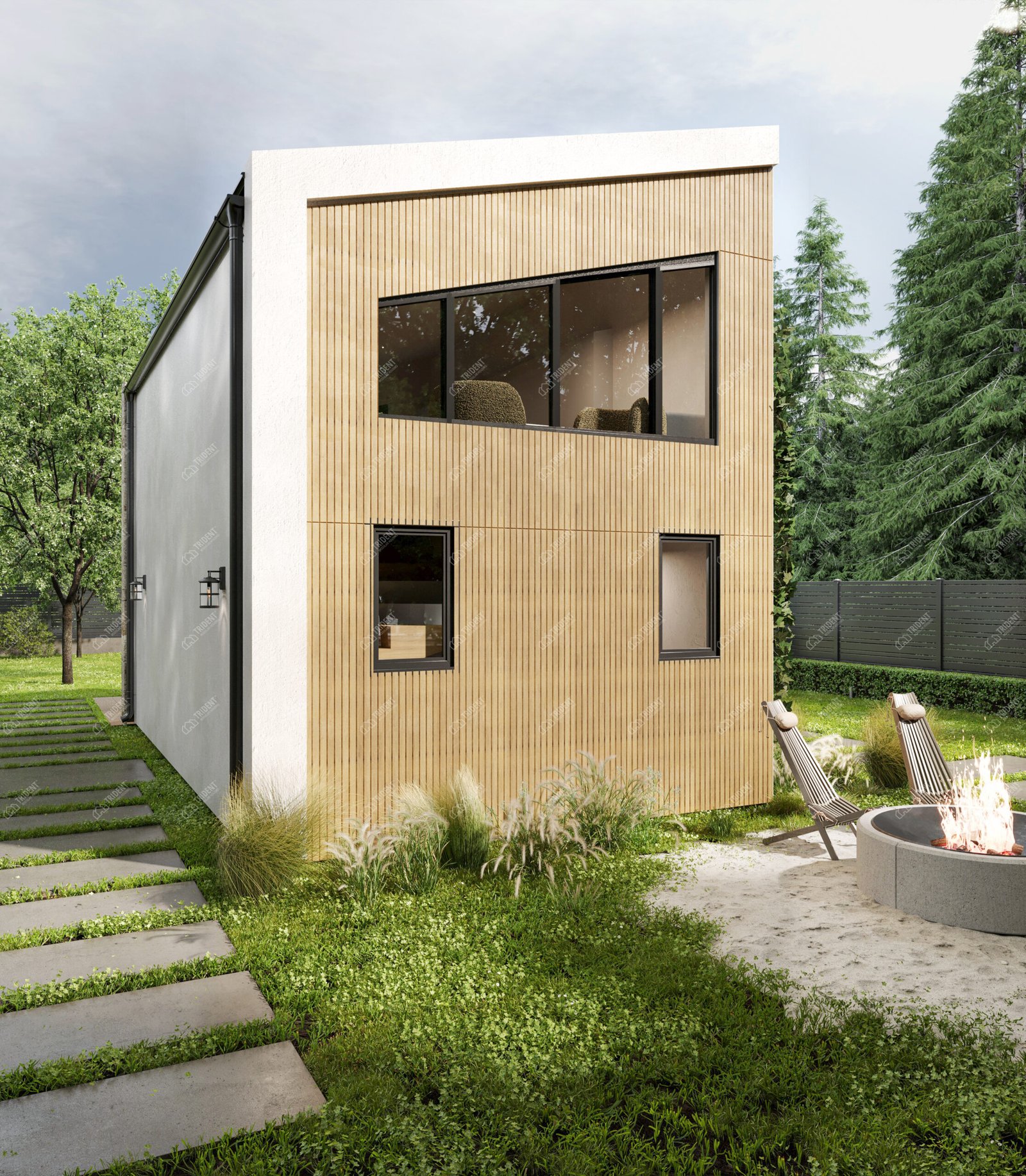 Стильний двоповерховий смарт-котедж площею 54 м², який пропонує функціональність повноцінного будинку на мінімальній ділянці забудови.