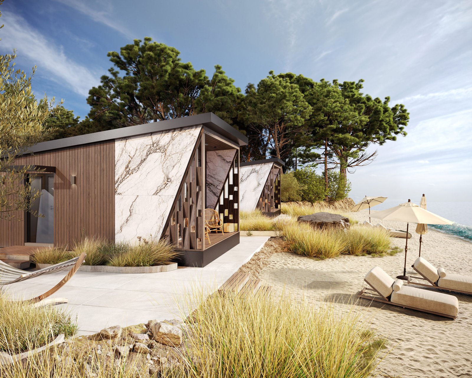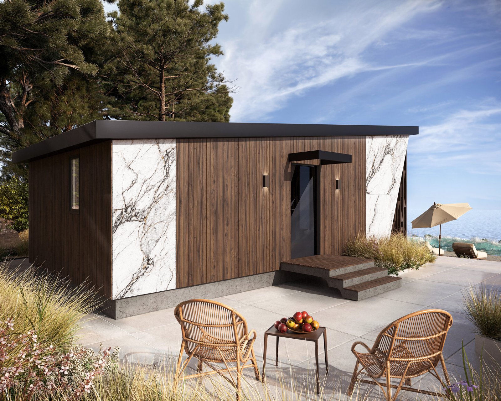 Зовнішній вигляд будинку базується на контрасті фактур. Поєднання натурального дерева з преміальними панелями під білий мармур надає будівлі статусного вигляду, не втрачаючи при цьому легкості. Панорамне скління з боку тераси стирає кордони між інтер’єром та зовнішнім світом, наповнюючи простір природним світлом.