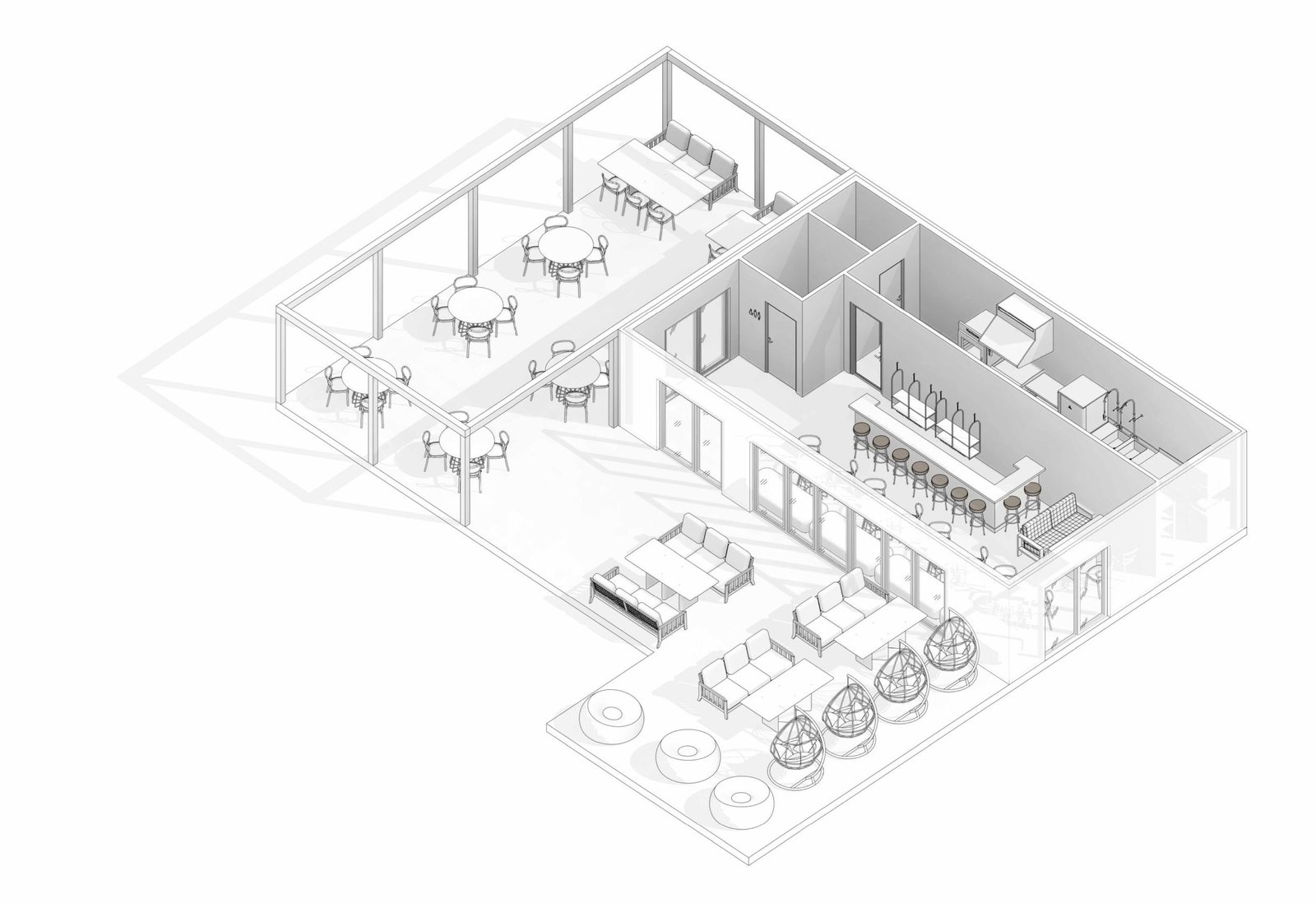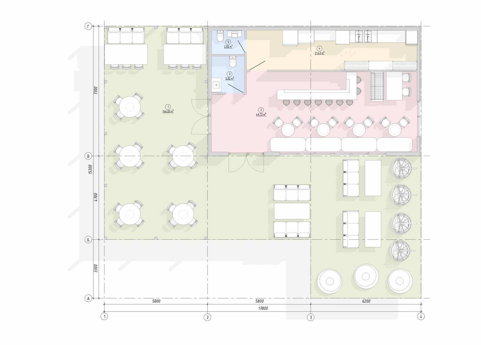 Внутрішній простір будівлі спроєктований з урахуванням потреб кафе або кав’ярні. Планування дозволяє ефективно організувати роботу персоналу та комфортне перебування відвідувачів.