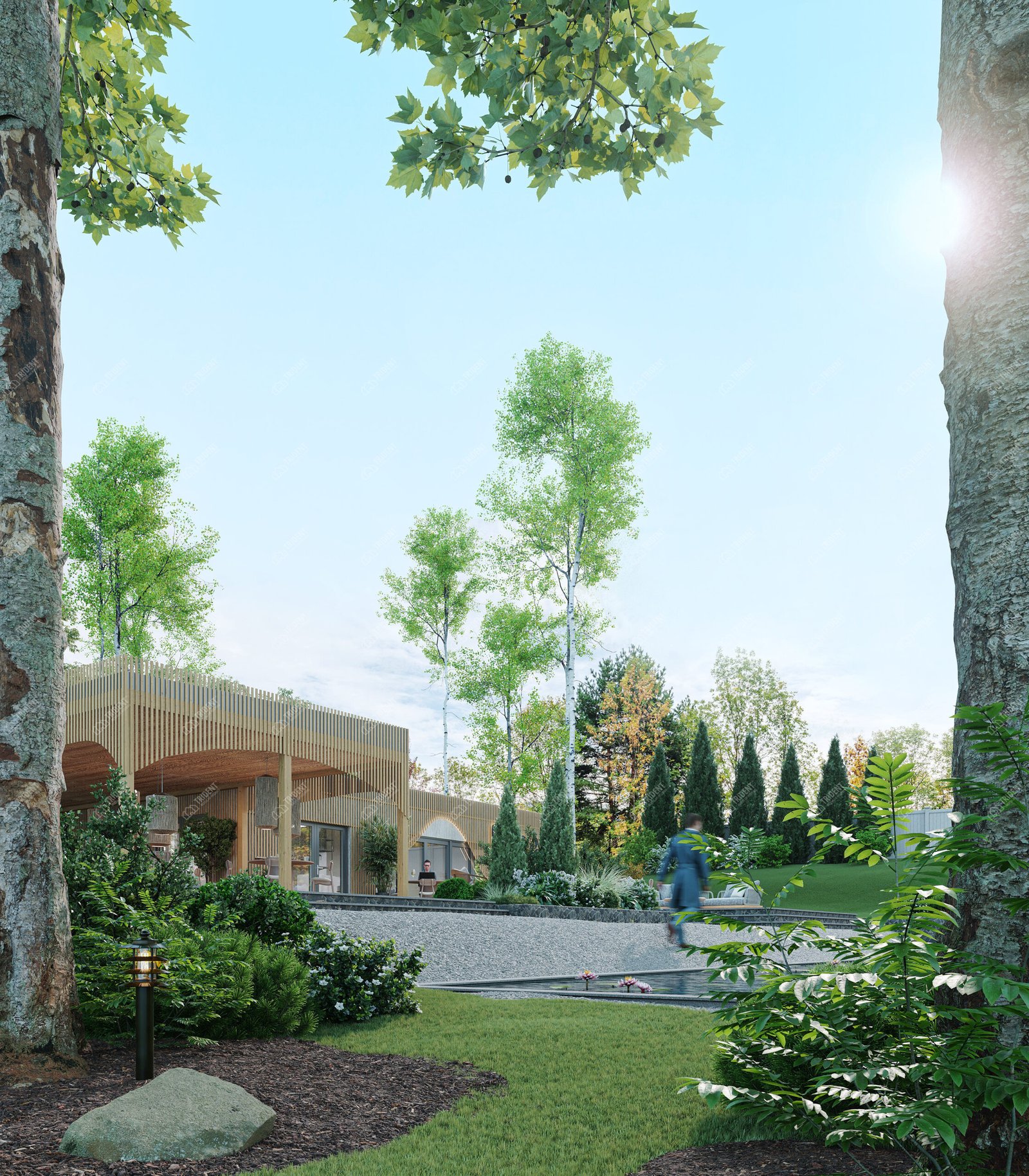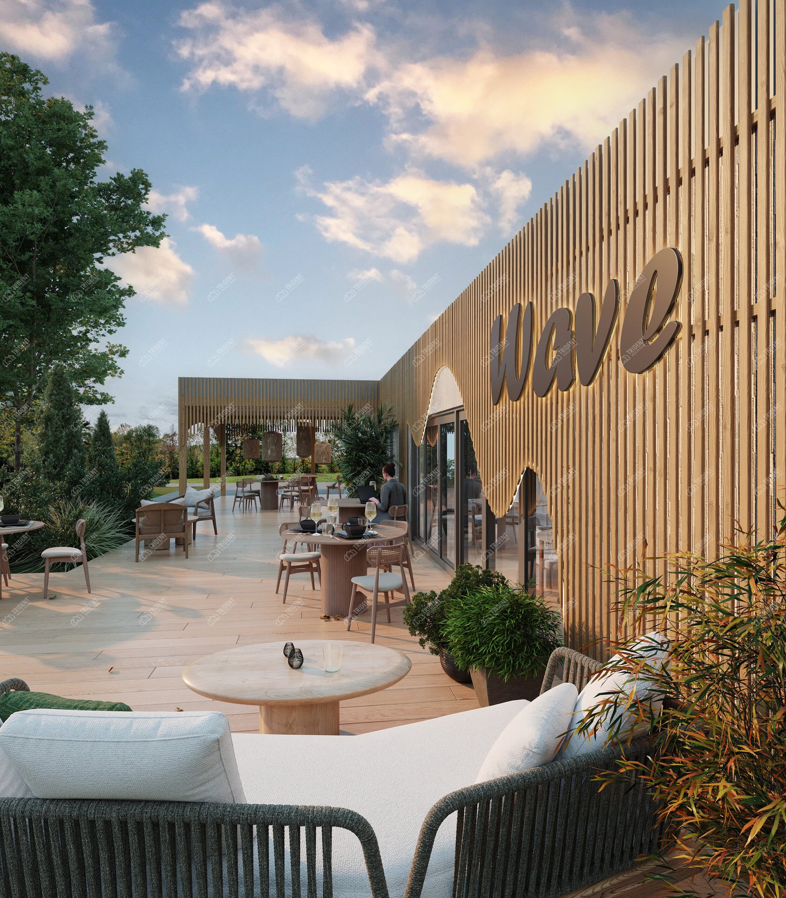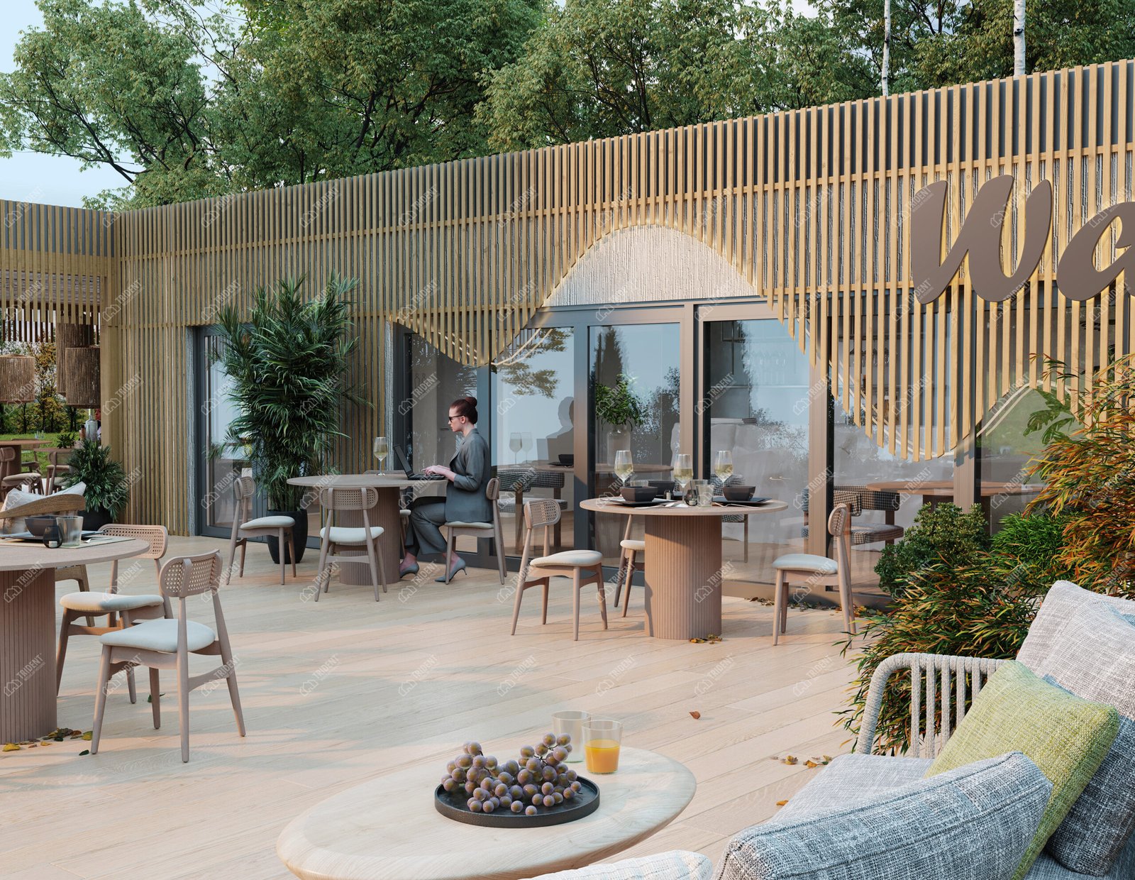 ModWood Cafe має стильну сучасну архітектуру з використанням натуральних або деревоподібних матеріалів у фасадах. Великі площини скління створюють відкритість простору, наповнюють приміщення природним світлом і роблять заклад привабливим для гостей.