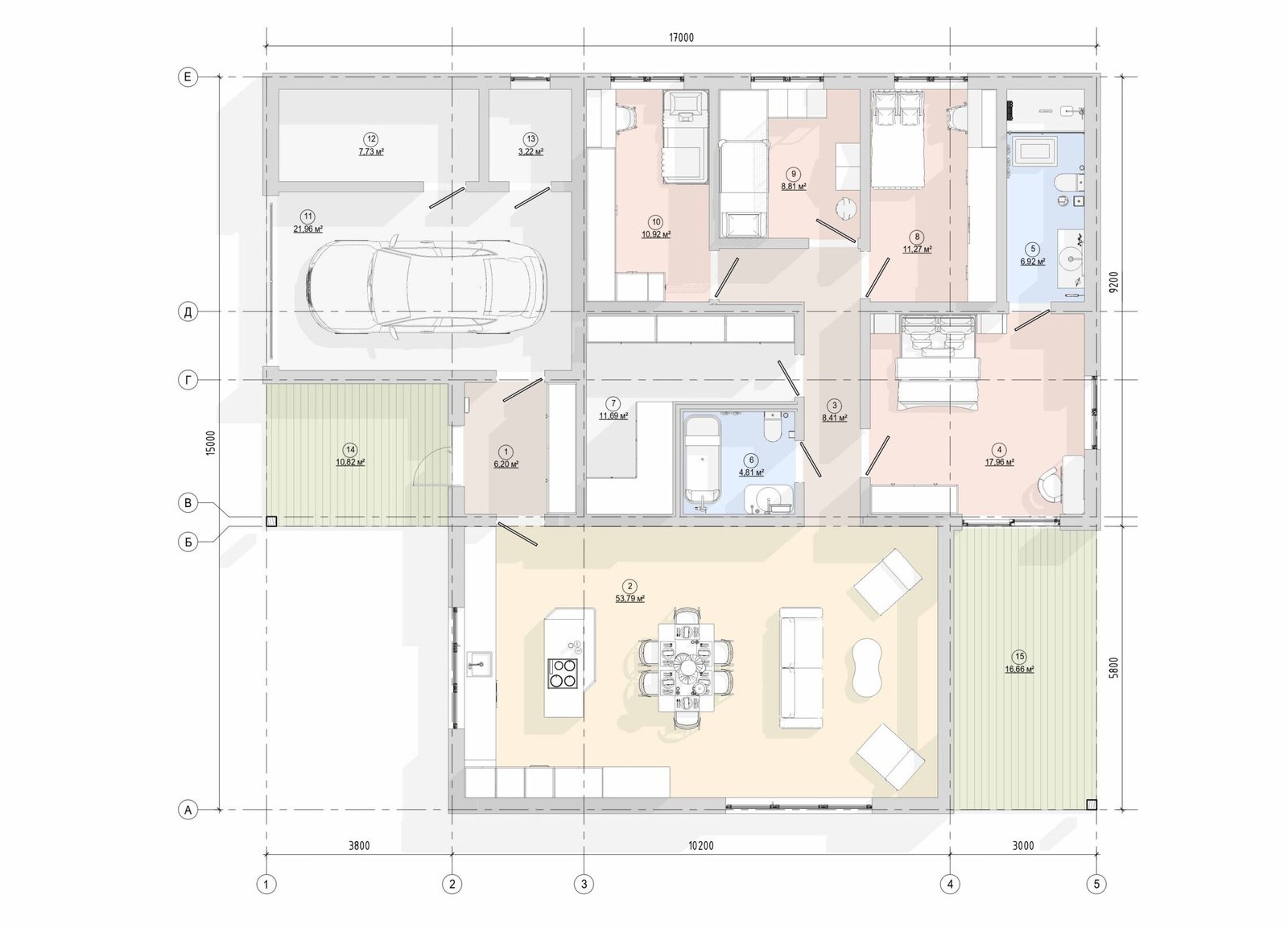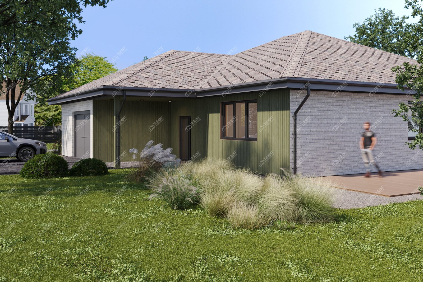 Флагманський одноповерховий будинок з чотирма спальнями, вбудованим гаражем та величезною вітальнею, створений для комфортного життя великої родини за сучасними каркасними технологіями.