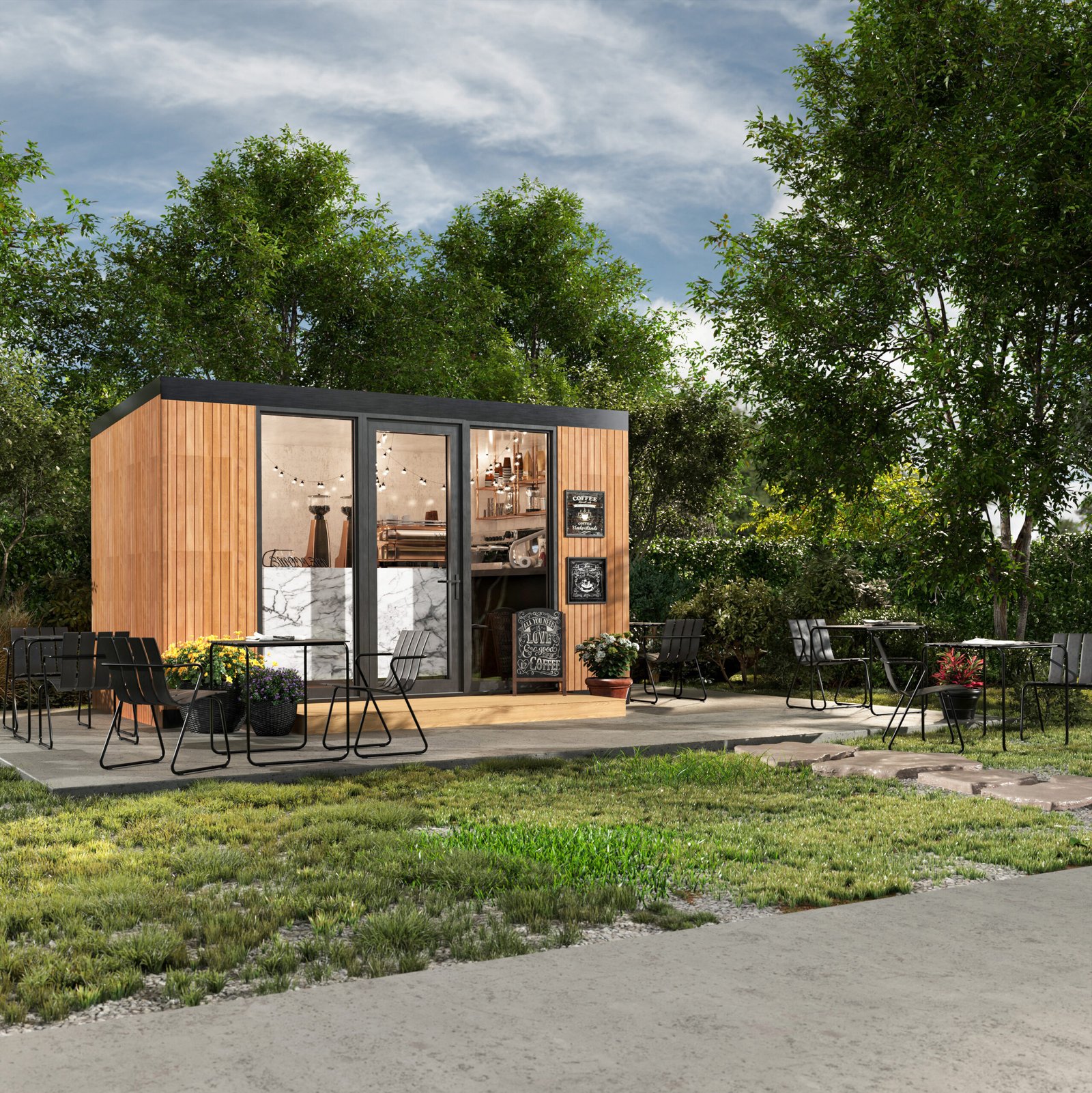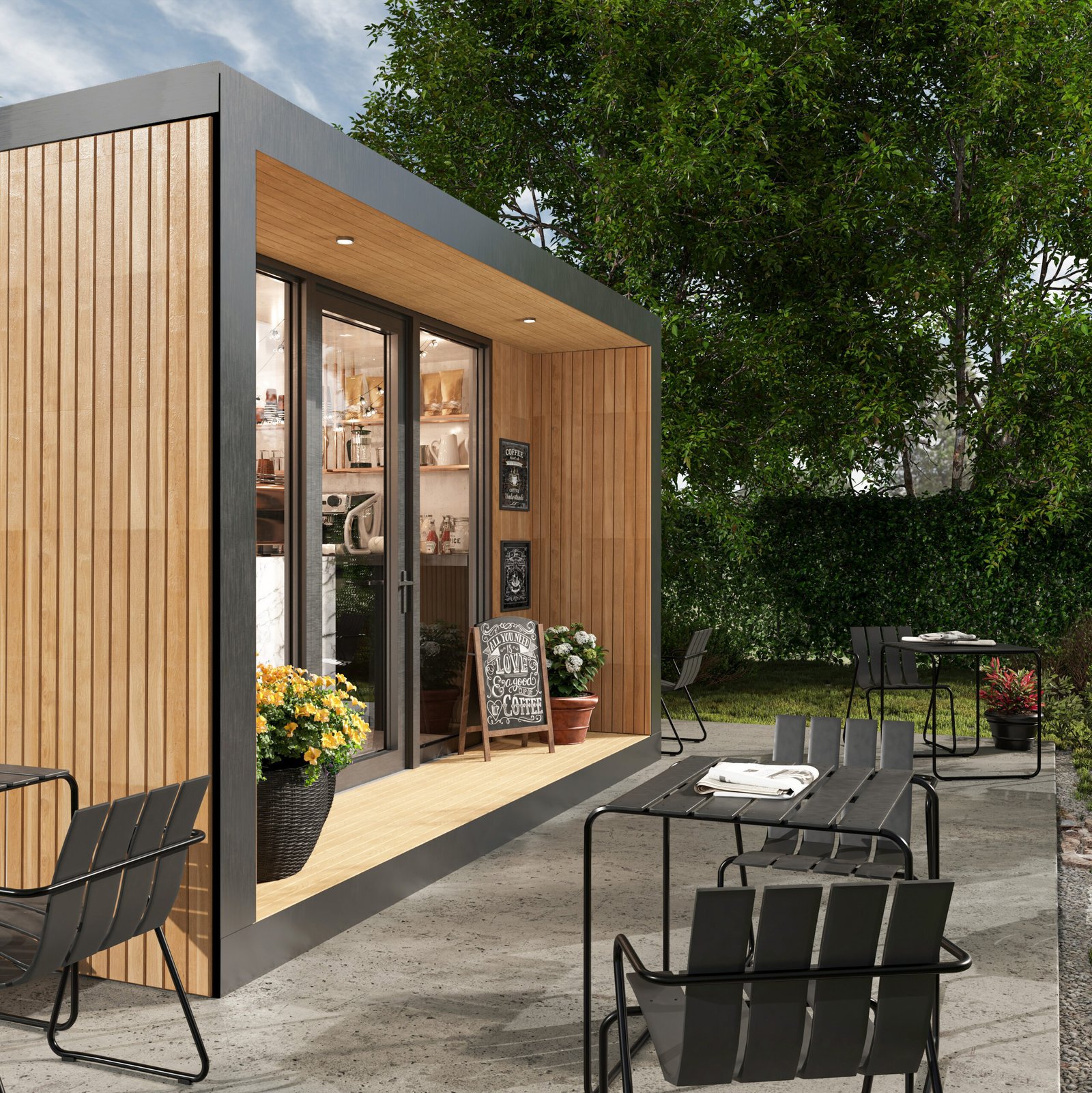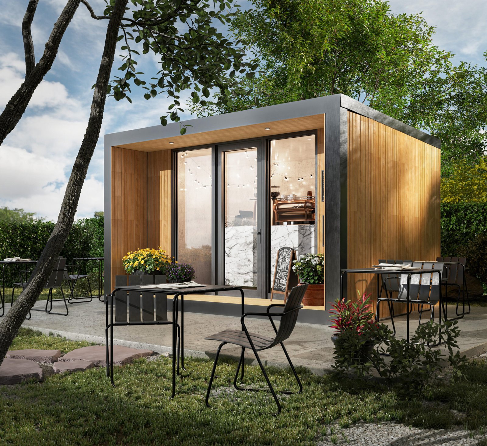 Garden Cafe — это готовое решение для быстрого запуска кофейни, фреш-бара или мини-бистро. Стильный, современный павильон создан, чтобы привлекать внимание и генерировать поток клиентов с первого дня работы. Панорамное остекление превращает заведение в яркую витрину, приглашая посетителей внутрь, а продуманная внутренняя планировка позволяет эргономично разместить оборудование и рабочую зону бариста. Главное преимущество — скорость. Модуль приезжает полностью готовым (с отделкой и электричеством). Вам остается только подключить коммуникации и занести кофемашину. Технология Trident Modular обеспечивает высокую энергоэффективность, что критически важно для снижения затрат на отопление и кондиционирование бизнеса.